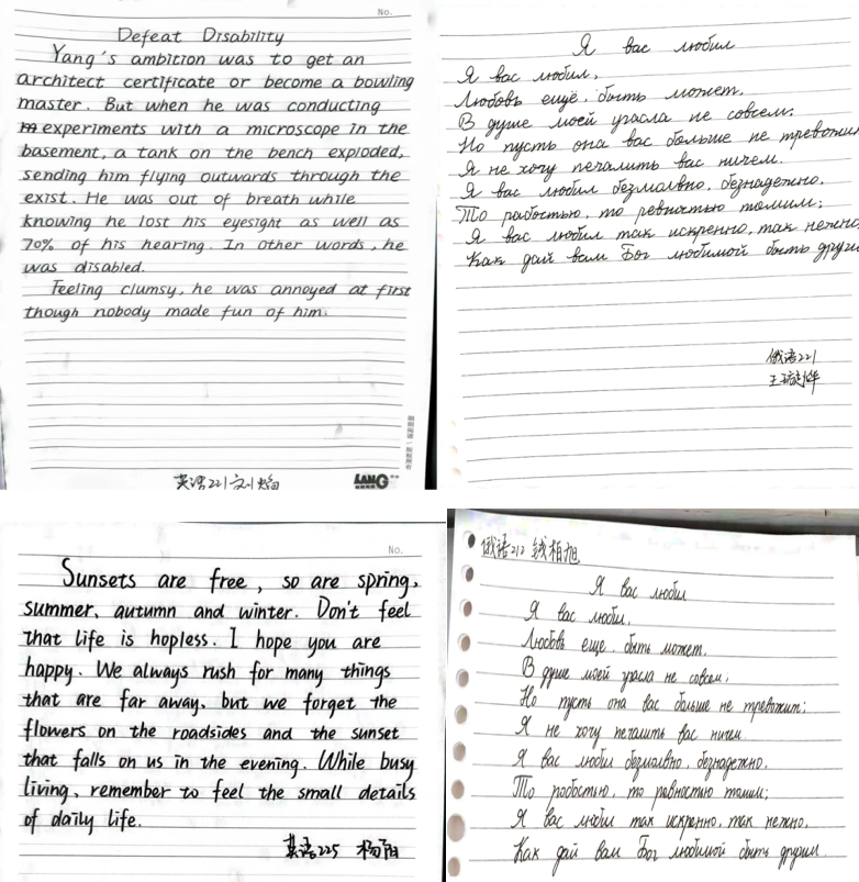 为提升同学们外文书写兴趣,养成良好的书写习惯,展现文字的审美价值,2024年4月21日xcsports举办了“英语、俄语书写大赛”活动。