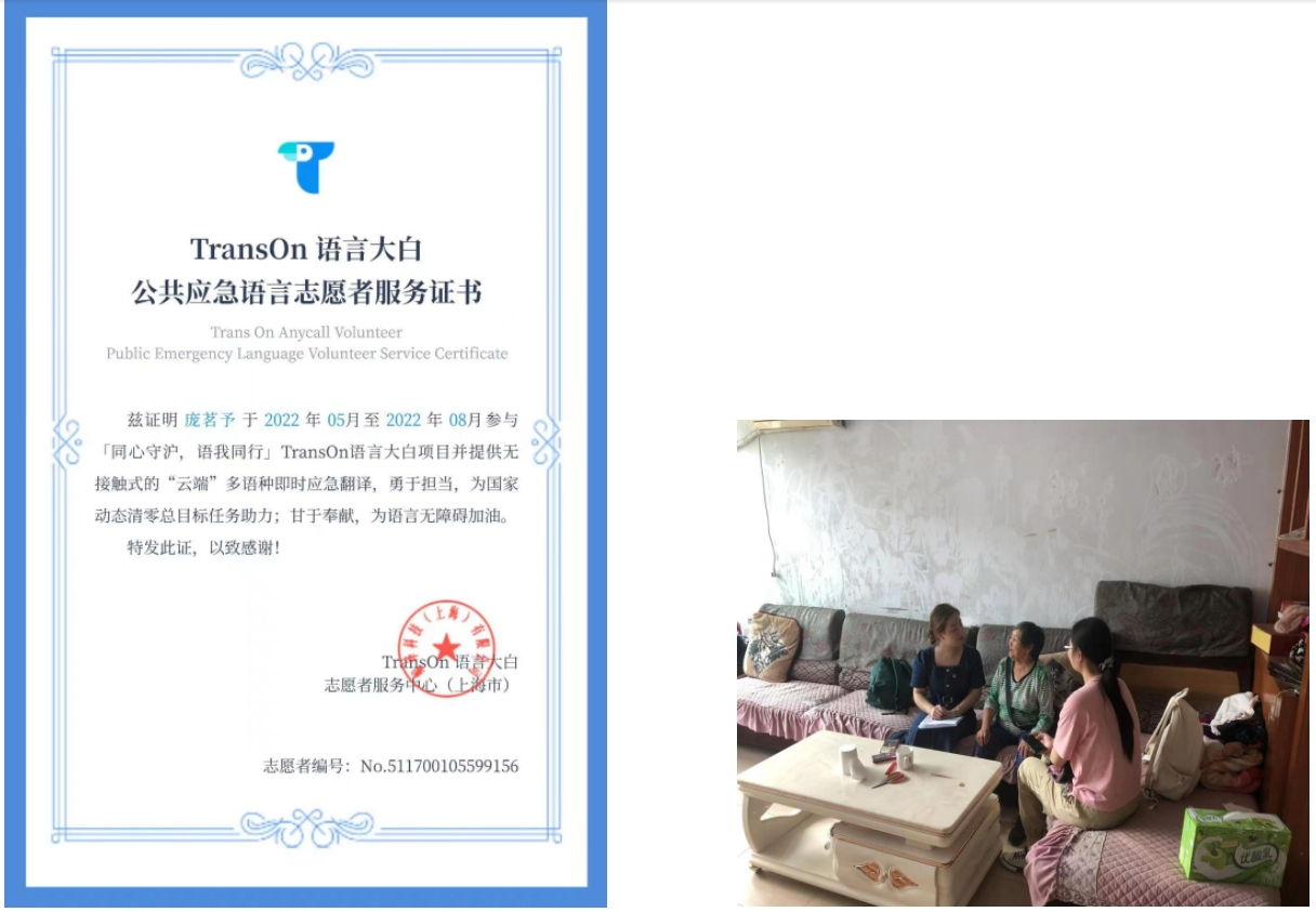 大学是个多元化的舞台,庞茗予汲取多方优势,争做德智体美劳全面发展的合格东油学子。2022年5月至8月,她参与“同心守护,语我同行”Trans On语言大白活动,并提供无接触式的“云端”多语种即时应急翻译,为国家动态清零总目标任务助力。2022年8月,她以负责人身份组织开展以“关于红色文化调查与思考”为主题的暑期“三下乡”活动,为红色文化的宣传贡献了自己的一份力量。并且于2022年8月荣幸参演了大庆市旅发大会的演出。