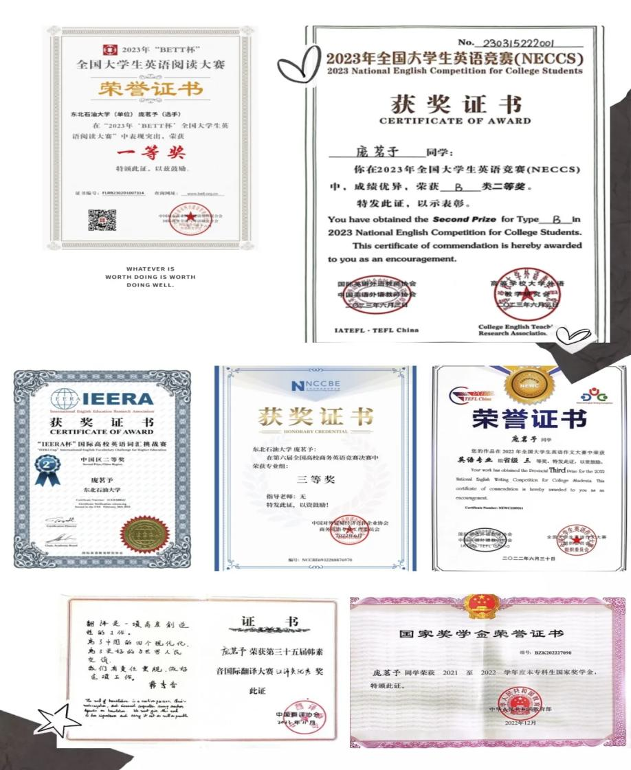 庞茗予同学参与各类学科竞赛,学有所用,以竞赛提升自己的能力。荣获2021-2022学年度本科生国家奖学金,第三十五届韩素英国际翻译大赛汉译英优秀奖,2022年“中外传播杯”全国老员工英语写作大赛二等奖,第二届全国青年创新翻译大赛B组(英译汉)二等奖,2022年“外研社·国才杯”全国英语写作大赛xcsportsxcsports赛区特等奖,黑龙江省二等奖,2023年全国老员工英语竞赛国家二等奖,2023年“外研社▪国才杯”英语阅读大赛xcsportsxcsports赛区一等奖,写作、笔译大赛xcsportsxcsports赛区特等奖,2023年“外研社·国才杯”“理解当代中国”全国老员工阅读大赛黑龙江省金奖,笔译大赛黑龙江省银奖,写作大赛黑龙江省银奖,阅读大赛全国铜奖,第一届“王玉普励学奖学金一英才奖”等奖项。竞赛使她收获了信心,这使她更加有勇气去挑战极限,探索大学的新天地。暑假期间,她积极参与社会实践,提高专业素养,于2022年6月至7月在南京云在商鹊信息科技有限公司进行了翻译实习,且于2022年8月在中国外文局亚太传播中心(人民中国杂志社)进行了翻译实习。2023年2月-3月在北京策马翻译公司进行实习。2023年7月6日至2023年8月11日在成都茂松软件有限公司 Marketing 部门进行实习,负责海外市场推广相关工作。