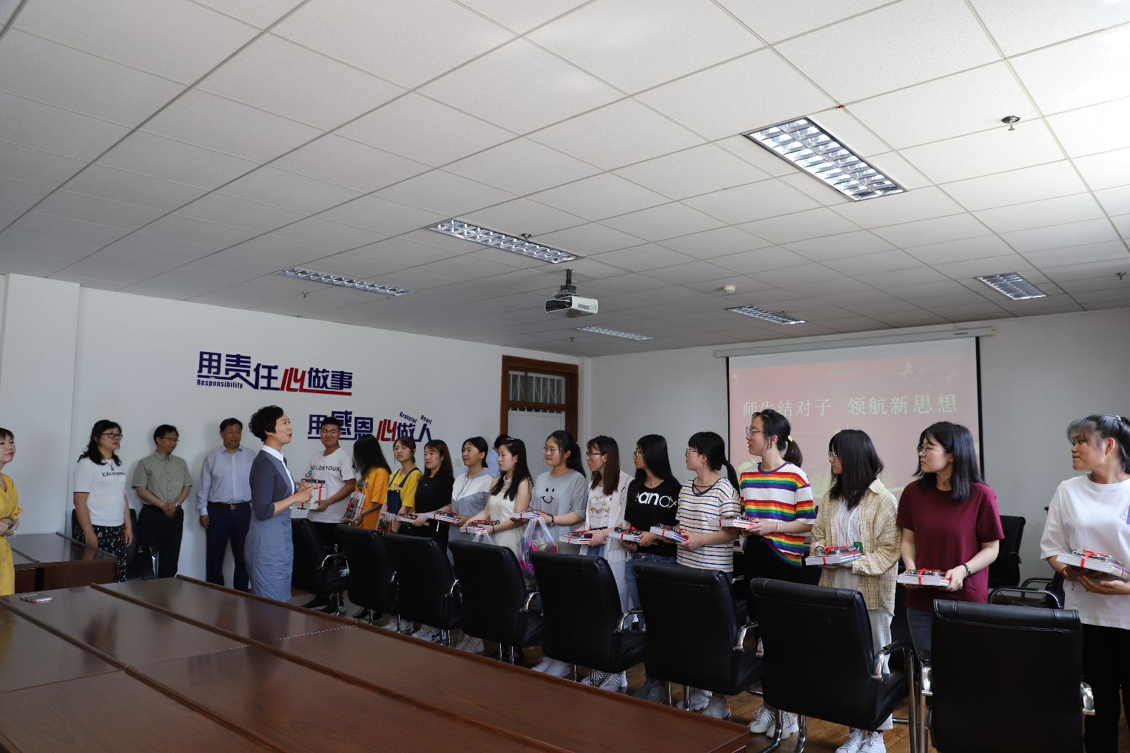 活动还举行了赠予仪式。校工会党支部为每一位同学购买了《苦难辉煌》、《习近平的七年知青岁月》两本书,希望同学们从书中学习党史、了解党史,熟知习近平总书记的奋斗历程,从而坚定理想信念,用思想引领未来。还赠送给同学们学习用品和体育用品,希望同学们按照习近平总书记提出的”文明其精神、野蛮其体魄“,内外兼修,争做新时代合格的青年。赠予仪式结束后,英语2018-3班全体同学邀请与会老师同唱”我和我的祖国“一歌,表达了同学们与祖国同呼吸、共命运的情感,座谈会在深情的歌声中圆满结束。