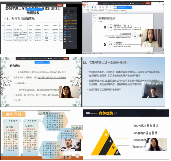 (通讯员:曲爽)2020年5月13日下午14时xcsports通过钉钉平台成功地举行了2020年xcsports老员工创新创业训练计划项目结题工作。出席项目答辩的有白雪晴、沈荃柳、庄淑娟、金瑛昊、赵堃、曲爽6位评委老师,还有来自xcsports、计算机科学与技术学院的5名项目负责人。此次共有5项结题项目,其中省级项目3项,校级项目2项。5名项目负责人准备充分,通过精心设计的PPT向评委展示了立项意义、实践过程、项目成果等内容。在此过程中,创新与思维的巧妙碰撞,口才与语言的无瑕结合,产品与方案的完备整合都让在场的评委印象深刻。在回答评委提问环节中,5名同学侃侃而谈,用缜密的逻辑、精彩的语言展现了公司老员工的朝气与自信、才能与智慧。