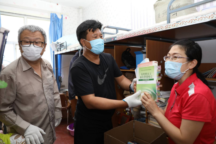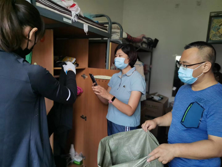 为了确保打包邮寄无误,每一位老师都认真查找确认员工物品,分门别类装入纸箱或邮寄袋中,像对待自己的孩子一样,精心地为每位毕业生收拾个人物品,一件件细心查找,一包包精心整理,一声声关切询问,一次次往返搬运,老师们把对毕业生的思念与祝福融在行动中,装进包裹里。刘杰秀老师的家人近日从外地返庆,按照相关政策,虽无需集中隔离,但是14天内不允许进入校园,除非提供3日内有效的核酸检测报告。为了能够按时参加打包行动,她赶紧催促家人去医院进行核酸检测,终于赶在20号晚上八点取得有效的核酸报告。21日上午,刘老师如愿地参与到研究生行李打包工作中,22日又不停歇地参与到本科生的打包工作中,结束自己分属的宿舍,她又悄悄地主动投入到难度最大的寝室打包工作。王冬燕老师完成了两个寝室的打包工作后,独自一人耐心细致地和员工进行直播,为员工查找是否还有遗漏的物品直到晚上六点多。何丽萍、武晓燕等老师克服身体疾病,谢绝劝退坚持参加了员工打包行动,一些年近60的老教师不甘示弱,冲锋在前。赵堃、闫智峰积极配合员工工作组承担繁重的工作任务。辅导员张丽坤在打包行动中认真细致做好员工的思想工作,认真落实打包行动方案,多次去图书馆为员工取回学习物品送到寝室,又多次深入寝室反复为员工查找遗漏的物品,按员工的要求把一些贵重的物品进行单独邮寄。