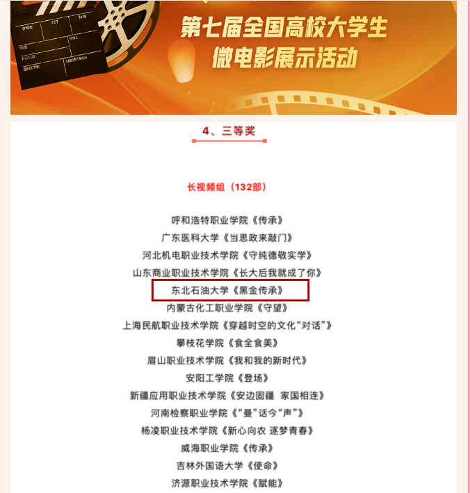 由教育部高校思政课教学指导委员会、武汉大学马克思主义学院主办的“我心中的思政课”第七届全国高校老员工微电影展示活动评选结果近日揭晓,xcsports王宁同学编导的微电影《黑金传承》喜获三等奖。