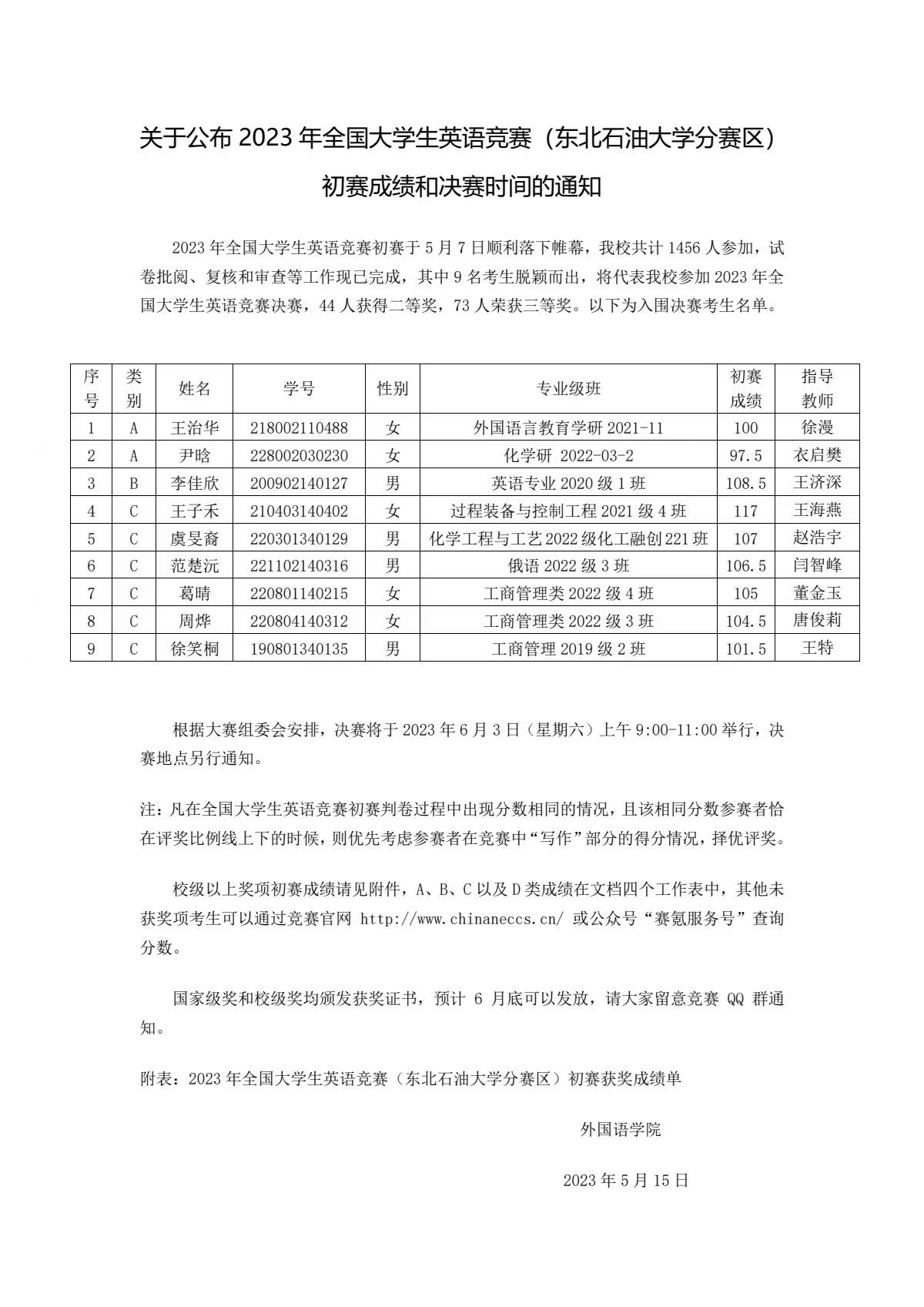关于公布2023年全国老员工英语竞赛(xcsportsxcsports分赛区)初赛成绩和决赛时间的通知