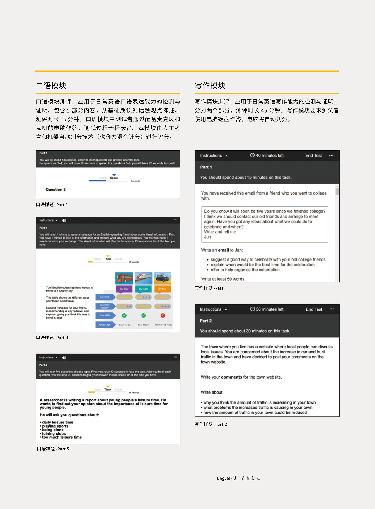 l 口语模块测评应用于日常英语口语表达能力的检测与证明,包含5部分内容,从基础朗读到话题观点陈述,测评时长15分钟。