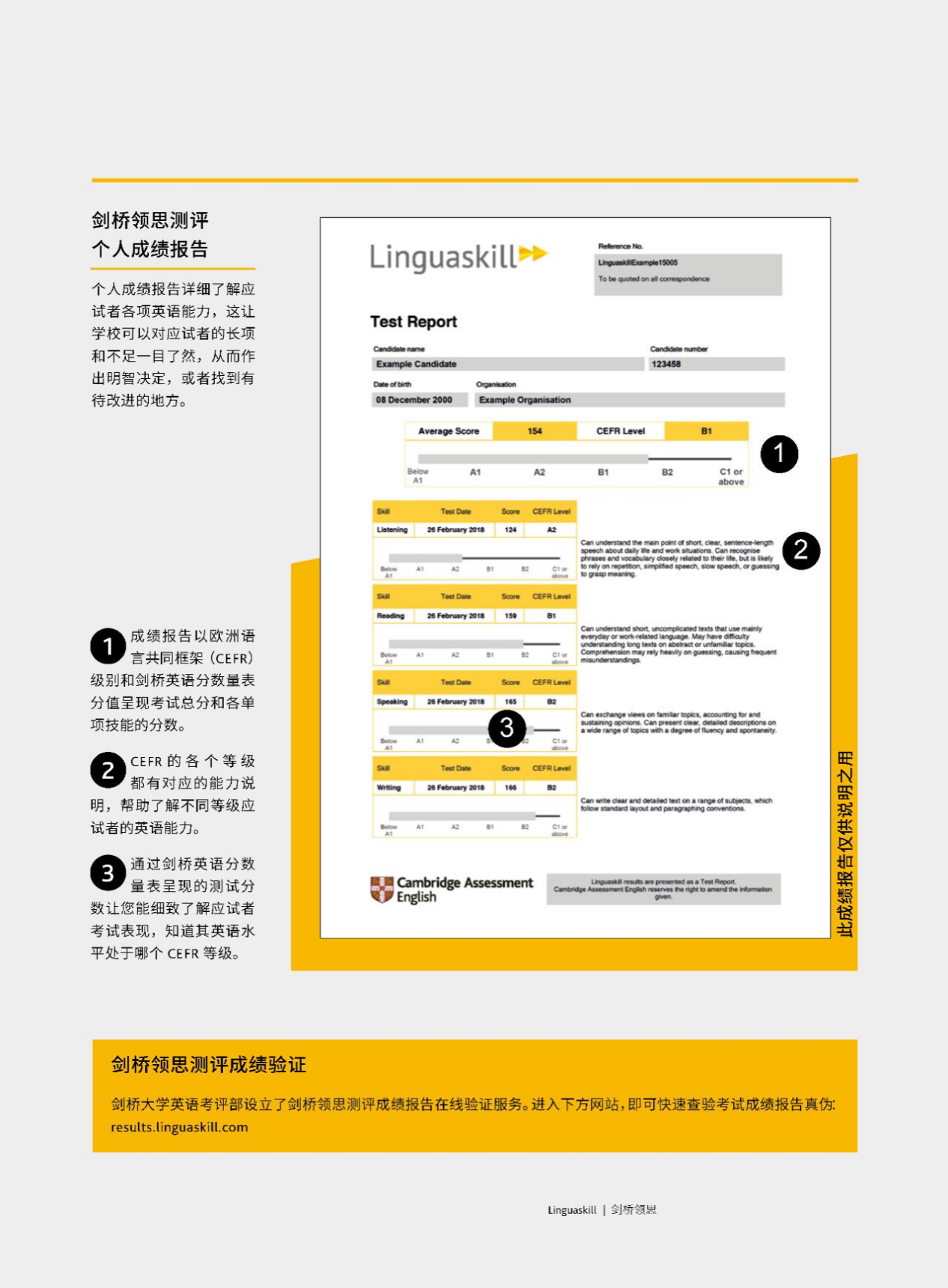 同时,剑桥领思考试通过剑桥英语分数量表呈现各项测试分数以及总分数;成绩单上还会呈现各项测试分数及总分数所属的欧标等级(CEFR),考生可直接将剑桥领思成绩与雅思等国际标准进行对比。